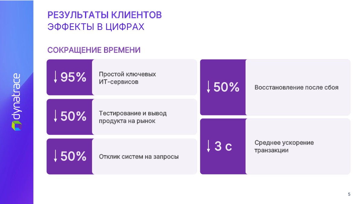 Dynatrace помогает решить эти проблемы. По данным клиентов компании, после внедрения платформы простои сократились на 95%, а вывод новых продуктов на рынок — на 50%.