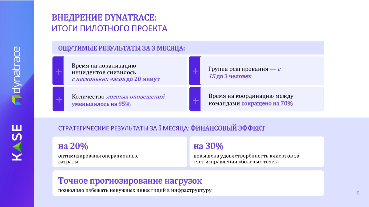 В рамках пилотного проекта Dynatrace удалось выстроить весь «жизненный цикл» продуктов, чтобы отслеживать их стабильность. Раньше за разные продукты ответственность несли разные отделы, и при появлении проблем над их решением работала большая команда специалистов — они «тушили пожар».