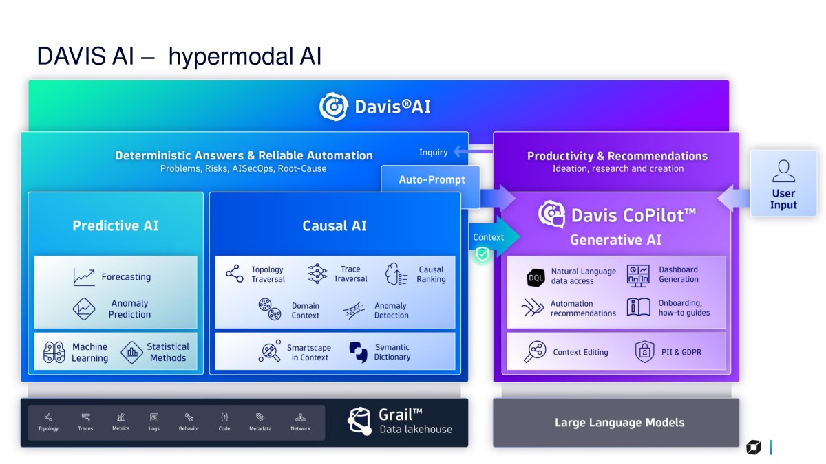 Фактически он использует данные от традиционных ИИ-инструментов. например, предиктивный ИИ работает над предсказанием возможным проблем и выявлением аномалий в системах. В свою очередь, Davis CoPilot занимается их интерпретацией для пользователей — визуальной или текстовой.