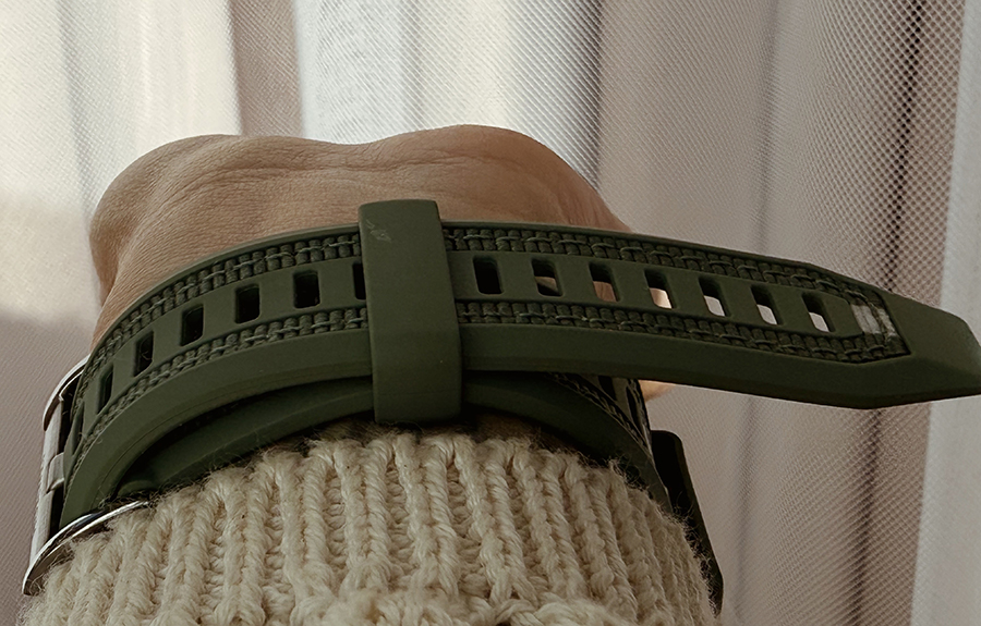 Крепление ремешка выполнено через аккуратный карабин — он изогнут под естественный угол, благодаря чему браслет не давит и не перекручивается, а ложится по руке почти как ткань.