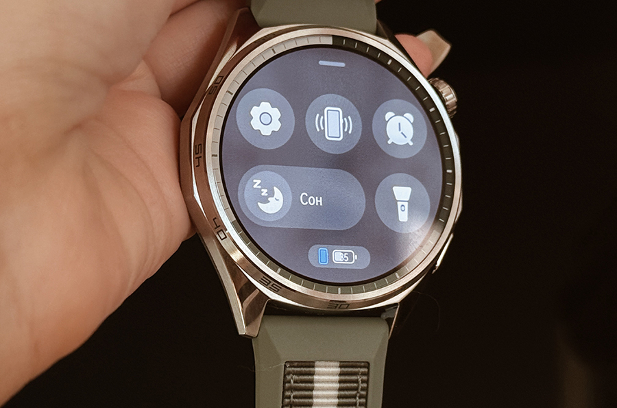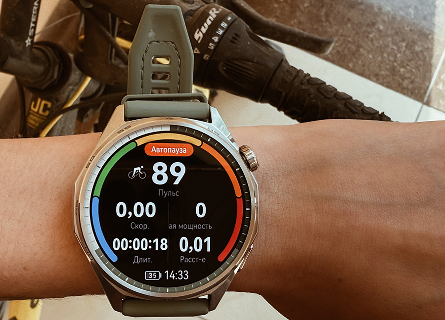 В течение дня часы почти не чувствуются на руке — корпус легкий, ремешок мягко прилегает, а керамическая тыльная часть не раздражает кожу, даже если часы остаются на запястье весь день. Когда я за рулем, мне удобно просматривать уведомления: экран достаточно яркий, а буквы объемные. В обед я часто выхожу на короткую прогулку, и GT 6 автоматически распознает шаги, предлагает включить режим ходьбы и показывает маршрут на карте, если активировать GPS.