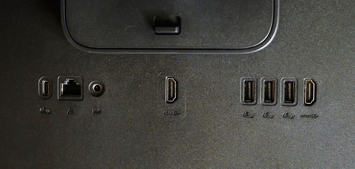— Задняя панель — центр управления. Все основные коммуникации спрятаны сзади, чтобы провода не мозолили глаза. Набор портов здесь солидный даже для серьезной рабочей станции: 3xUSB-A 3.2 (скоростные порты для принтеров, сканеров или внешних жестких дисков, где важна скорость передачи данных); 1xUSB-C 3.2 — современный разъем для быстрой зарядки гаджетов или подключения периферии нового поколения; LAN (RJ45), для стабильного проводного интернета; HDMI 1.4 (выход), если вам вдруг станет мало 27 дюймов, можно легко подключить второй монитор или проектор.