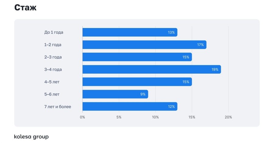 55% специалистов имеют опыт более 3 лет. 83% респондентов — мужчины, а 67% из них работают в Алматы.
