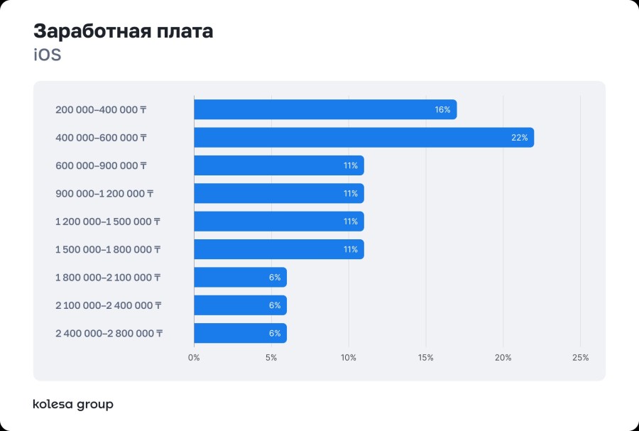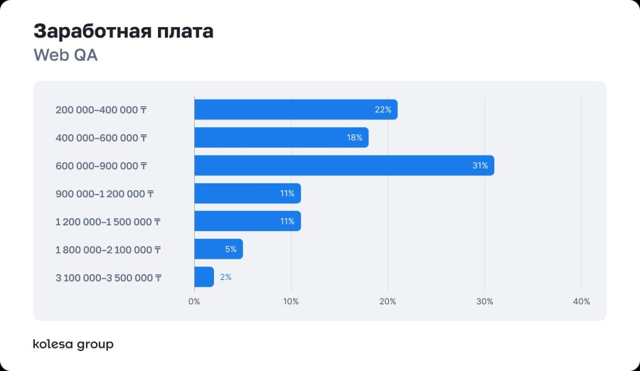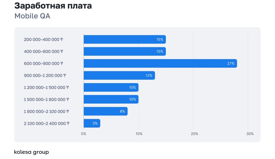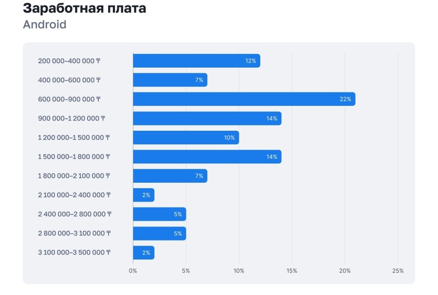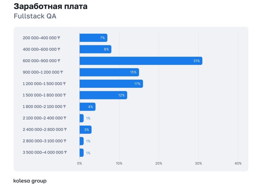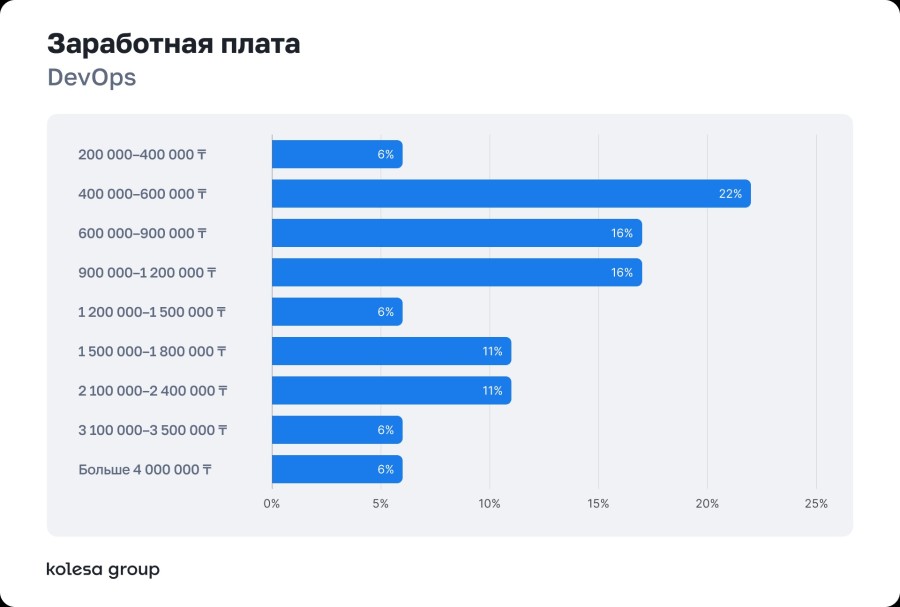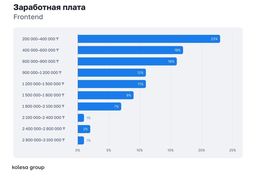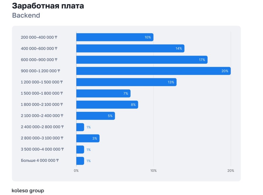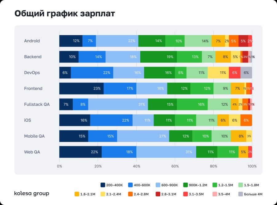 Заработные платы большинства специалистов сосредоточены в диапазоне 600–900 тысяч тенге. Самые высокие зарплаты в Backend и DevOps — до 4+ млн тенге.