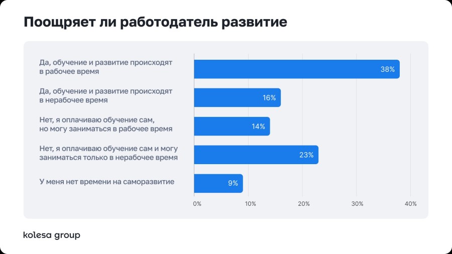 38% специалистов обучаются в рабочее время за счет компании, 16% — обучаются вне работы за счет работодателя.