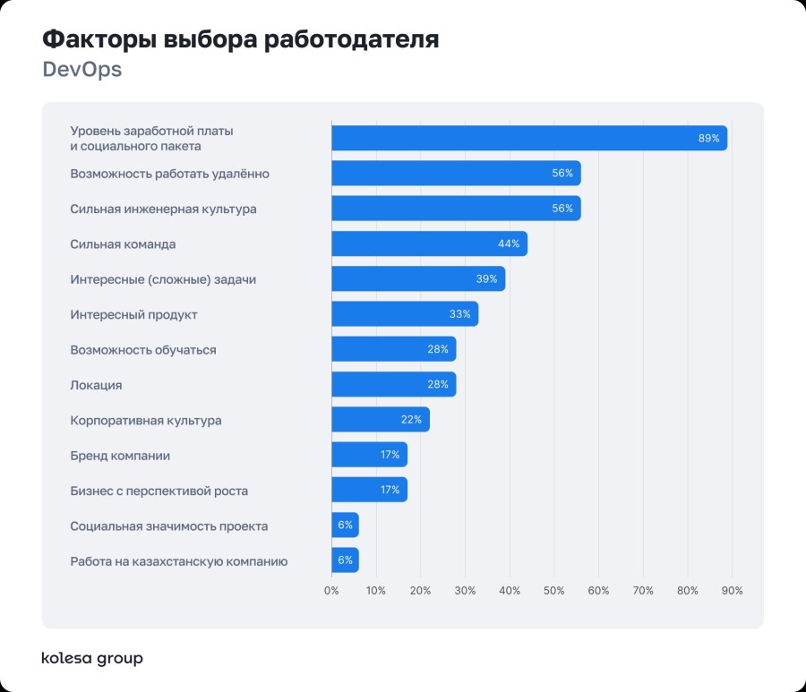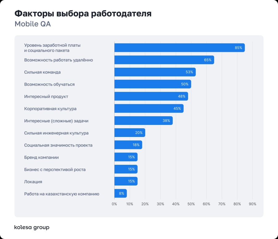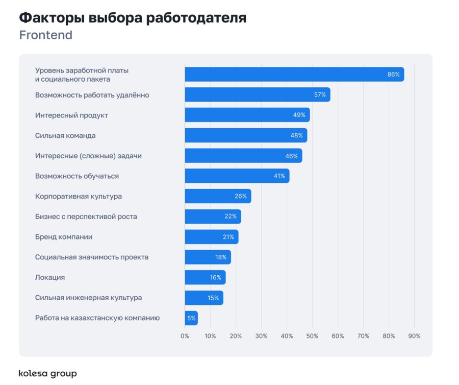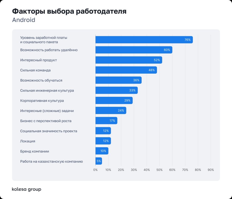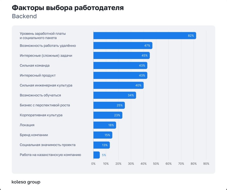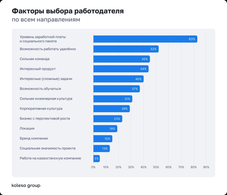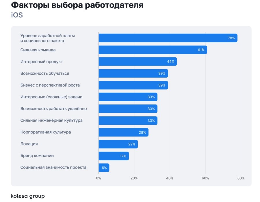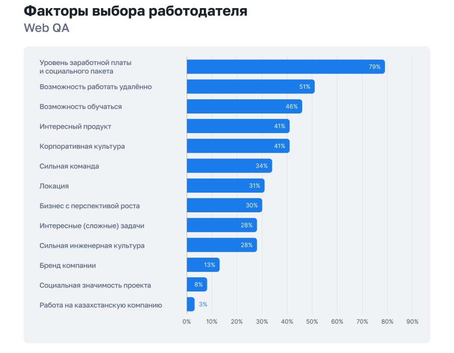 При выборе работодателя специалисты в первую очередь смотрят на зарплату и формат работы. Среди других факторов — сильная команда, инженерная культура, обучение и интересный продукт.