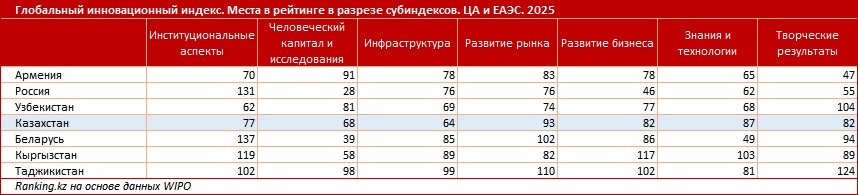 Страны ЦА и ЕАЭС занимают умеренные позиции в рейтинге GII. Так, Казахстан занял 81 место из 139, набрав 26,3 балла. Лидирует в регионе Армения: 59 место и 30,5 балла. Буквально следом идет Россия: 60 место и 30,3 балла. Узбекистан немного опережает Казахстан: 79 место и 26,5 балла. Замыкают региональный список Беларусь (85 место и 25,1 балла), Кыргызстан (96 место и 22,6 балла) и Таджикистан (108 место и 20,2 балла).