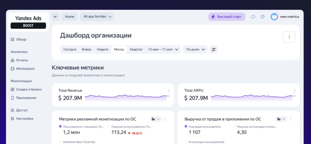 Yandex Ads Boost объединяет ключевые инструменты экосистемы Yandex Ads для аналитики и монетизации приложений. С их помощью команды могут управлять одним или несколькими приложениями, принимать решения о развитии продуктов на базе актуальных и объективных данных из единого источника. Например, отслеживать техническое состояние приложений, понимать, из каких каналов пришли новые пользователи и как они себя ведут, находить узкие места и разрабатывать новые возможности под потребности разных пользователей.