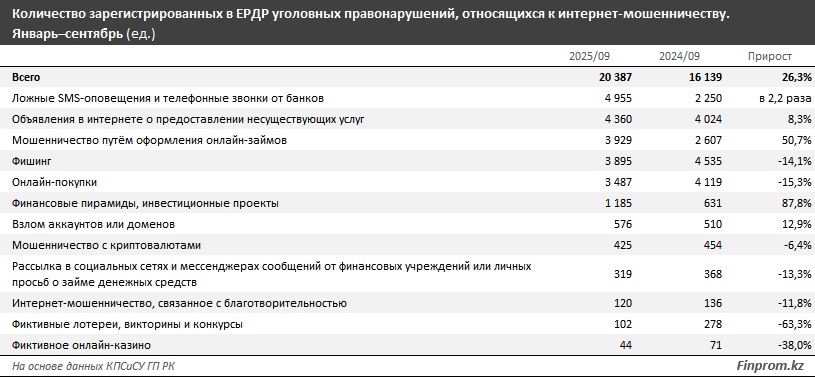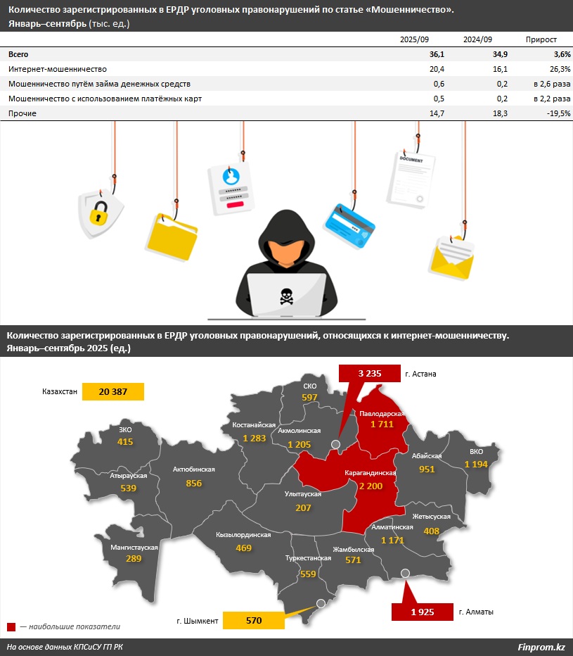 В Казахстане наблюдается очередной всплеск интернет-мошенничеств. За девять месяцев текущего года, по данным Комитета по правовой статистике и специальным учетам Генеральной прокуратуры (КПСиСУ ГП) РК, в Едином реестре досудебных расследований было зарегистрировано 20,4 тыс. уголовных правонарушений, относящихся к интернет-мошенничеству. В сравнении с аналогичным периодом 2024-го рост составил весомые 26,3%, передает Finprom.kz.