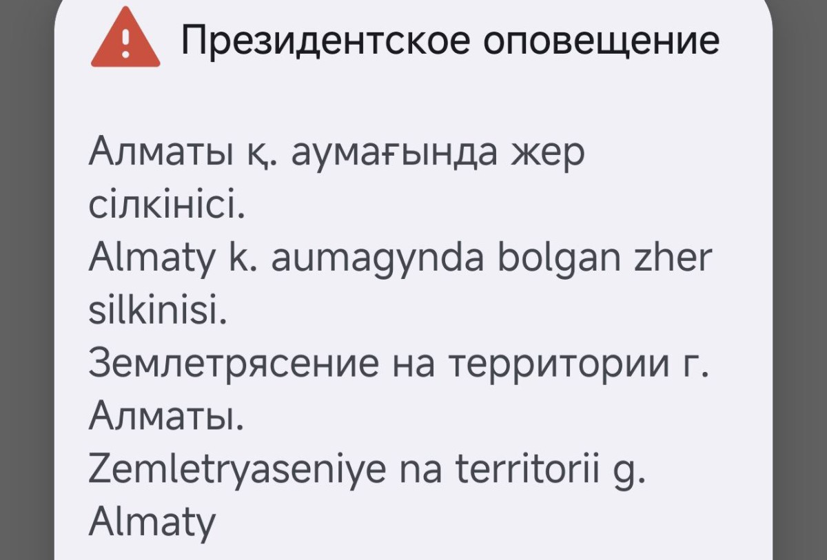 «Жители получили уведомления на телефоны посредством Mass Alert, прозвучали громкие голосовые предупреждения — городские сирены, в ТРЦ и общественных местах прошла эвакуация. Согласно алгоритму, люди начали покидать здания и выходить на улицу», — заявили в акимате Алматы.