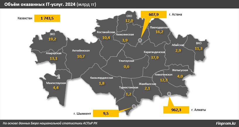 Рост в стоимостном выражении составил 25,9%. В том числе юридическим лицам оказали услуг на 1,4 трлн тг, физическим лицам — на 81,7 млрд тг, нерезидентам — на 303,7 млрд тг. В региональном разрезе наибольшие объемы услуг были зафиксированы в Алматы (962,3 млрд тг), Астане (607,9 млрд тг) и Карагандинской области (при этом всего 37,9 млрд тг), передает Finprom.kz.