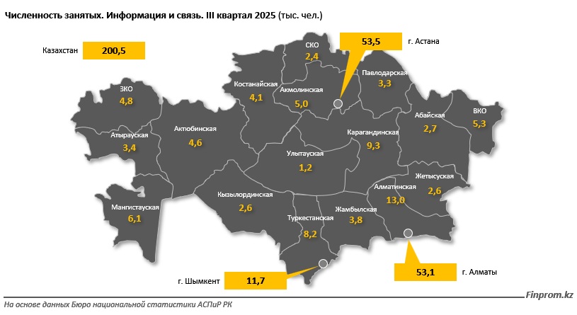 В региональном разрезе больше всего занятых в секторе насчитывалось в Астане: 53,5 тыс. человек (на 34,1% больше, чем годом ранее). Далее расположились Алматы и Алматинская область. Наименьшие показатели пришлись на Улытаускую, Северо-Казахстанскую и Кызылординскую области.