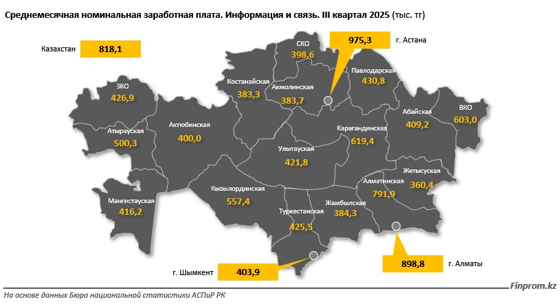 Среднемесячная номинальная заработная плата в сфере информации и связи в третьем квартале текущего года составила 818,1 тыс. тг — на 21,5% больше, чем в аналогичном периоде 2024 г. При этом реальной рост покупательной способности зарплат составил 8,2%.